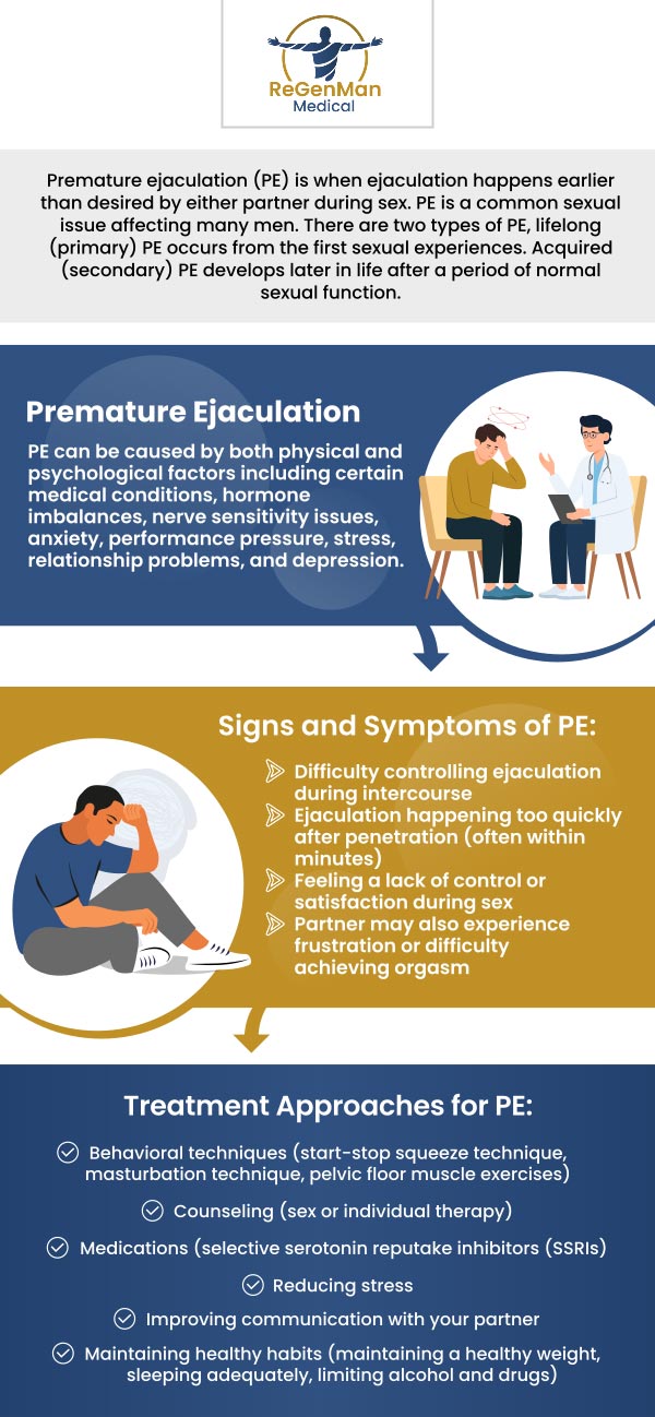 Premature ejaculation (PE) is a common men’s health concern that we frequently address at RegenMan Medical, a practice committed to men’s wellness and regenerative health. At RegenMan Medical, we approach PE with comprehensive, personalized care designed to optimize sexual health, performance, and overall quality of life.